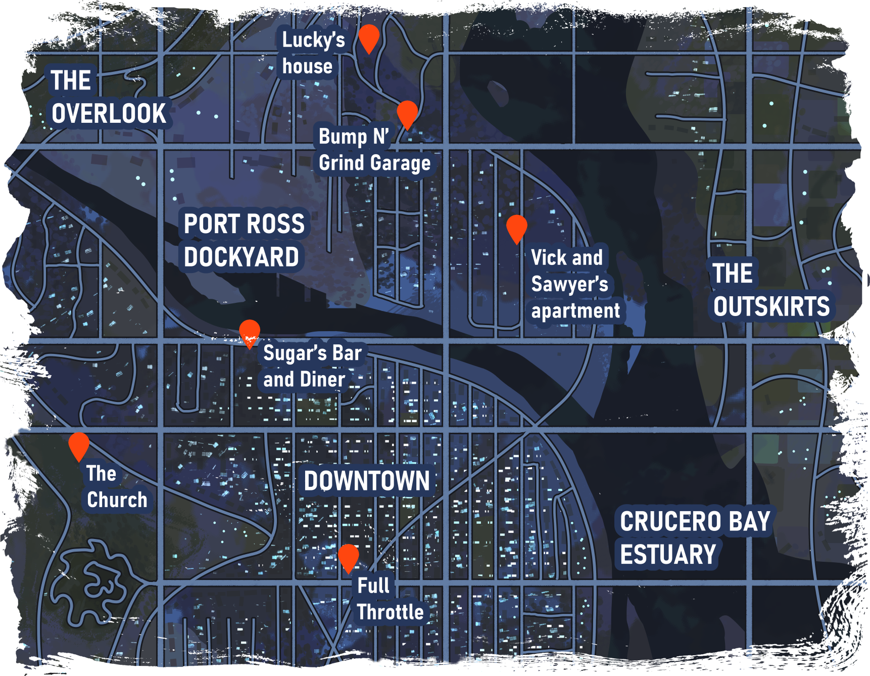 Crucero is a fictional US city, with the story taking place in 2019. It’s surrounded by smaller neighborhoods, and pockets of woodlands that lead to more rural areas. Inspired by a mix between Portland (OR), LA, and San Francisco.