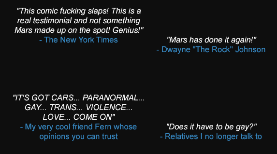 Mars Heyward is a comic artist, writer, muscle car liker, milkshake drinker, pro-catboy propagandist, pickled food abolitionist, human-shaped weasel, and Portlander. You can read his recently completed webcomic Long Exposure here.